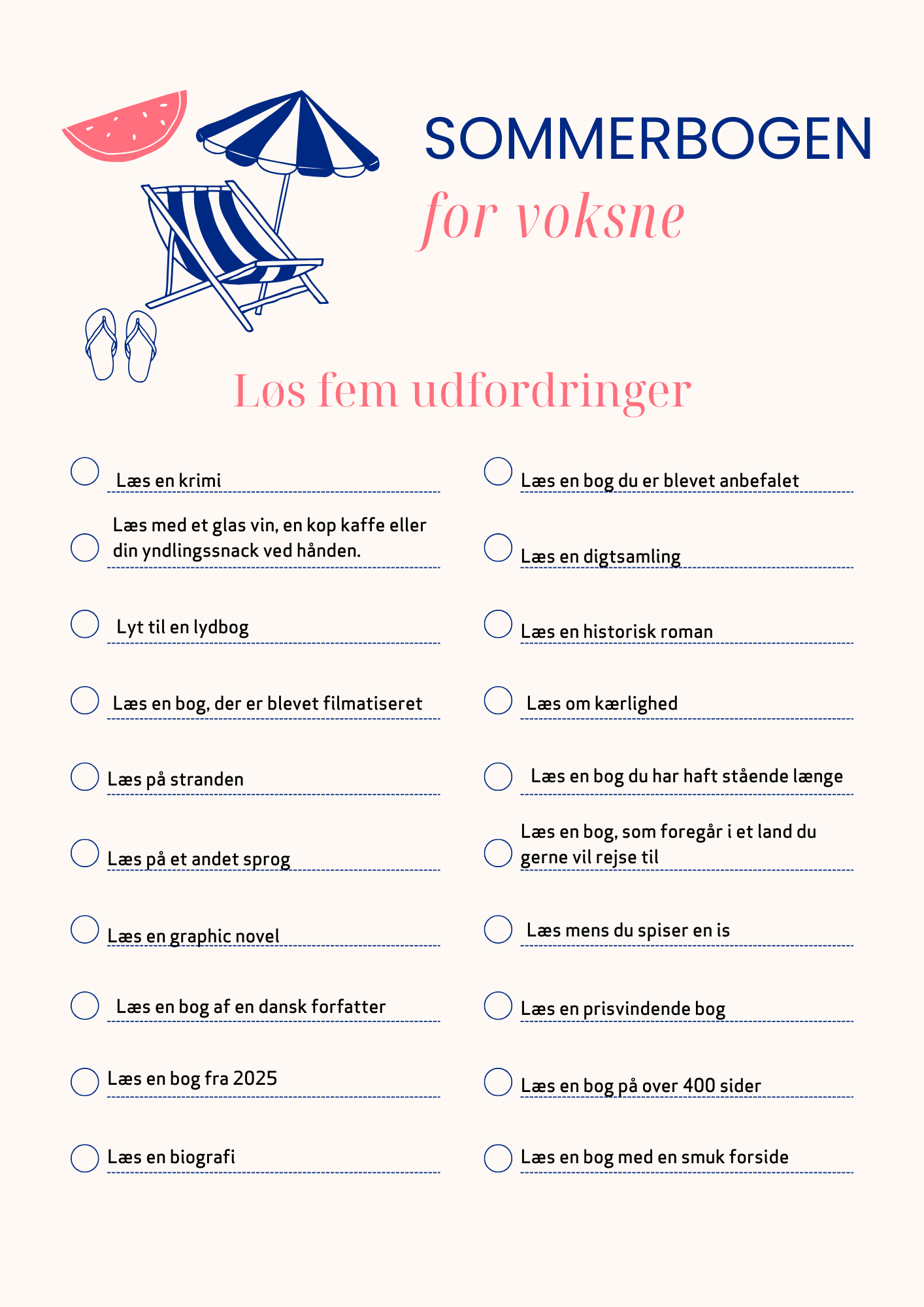 - Fuldfør 5 af de spændende læseudfordringer (vi lover, det er sjovere end at klippe hæk i 30 graders varme).