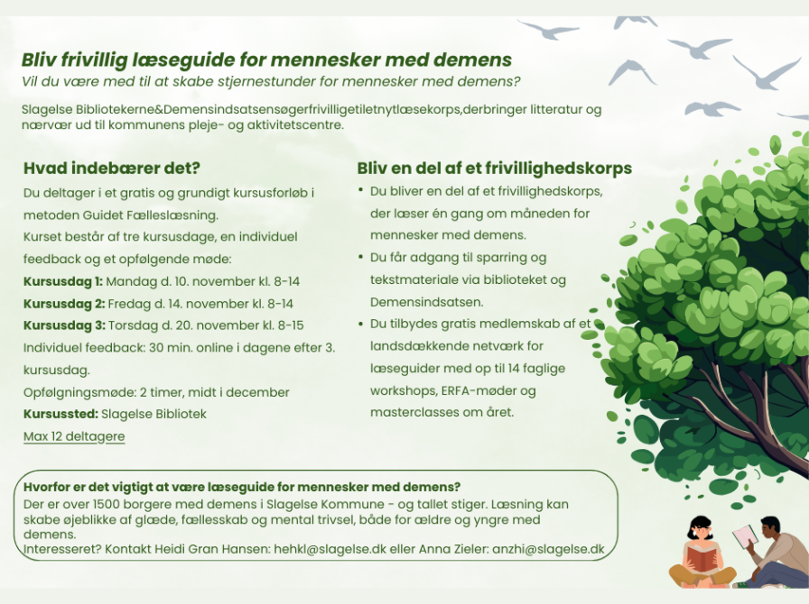 Slagelse Kommune søger frivillige læseguider til et nyt læsekorps, der bringer litteratur og nærvær ud til pleje- og aktivitetscentre.