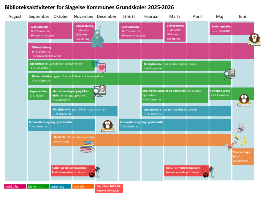 Her kan du se en samlet liste over Bibliotekets læringstilbud til Slagelse Kommunes skoler. Der er en bred vifte af tilbud og der kommer løbende nye til. Det er også her du kan finde vores særtilbud, som for eksempel forfatterbesøg. I kan læse mere om indhold i de enkelte tilbud længere nede på siden.